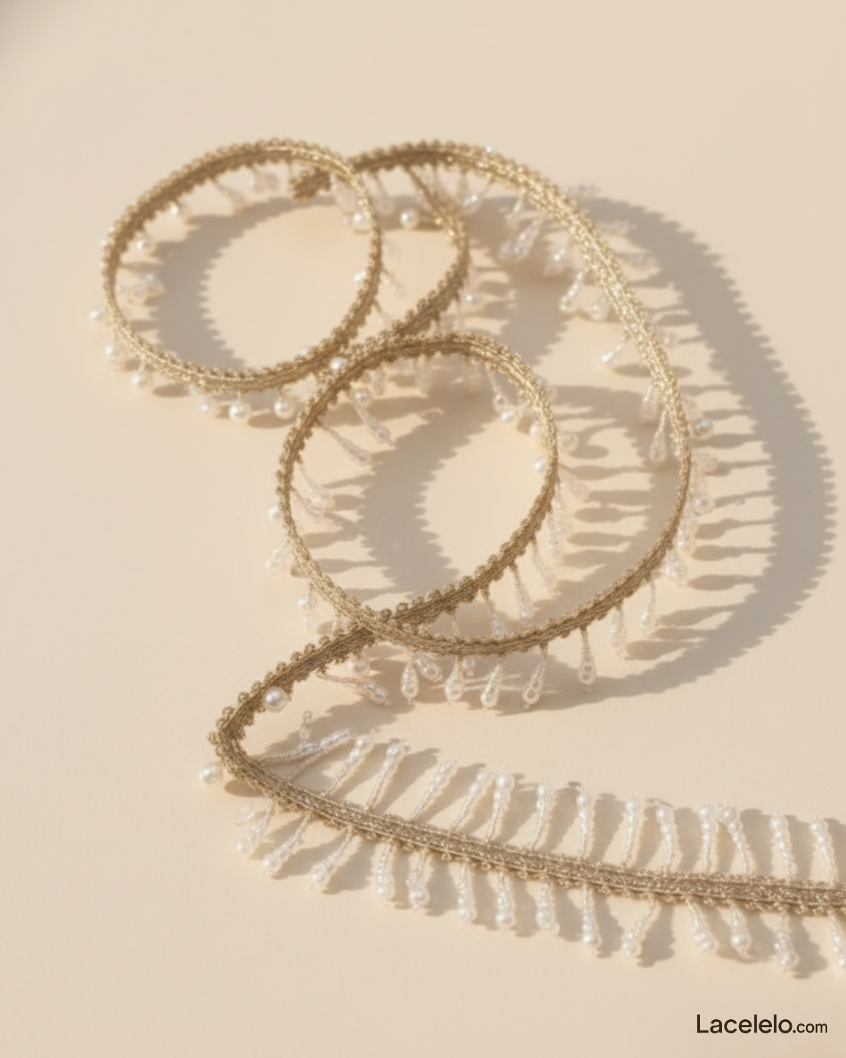 Elegant golden border lace with pearl detailing, perfect for sarees, suits, and crafts. Length: 8 meters per roll.
